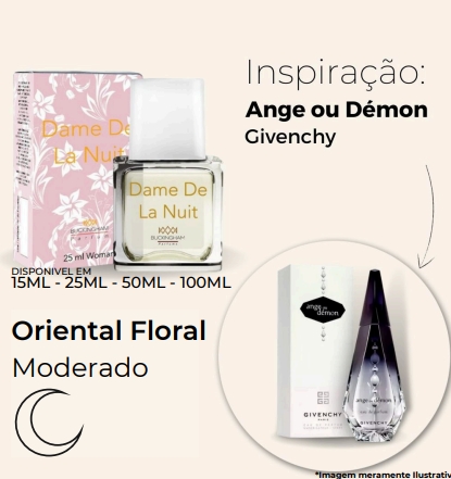 Descubra a essência sedutora e enigmática do 'Dame De La Nuit', um Eau de Parfum inspirado na icônica fragrância 'Ange ou Démon' da Givenchy. Com sua composição olfativa de floral oriental moderado, este perfume é perfeito para mulheres que buscam um toque de mistério e sofisticação.